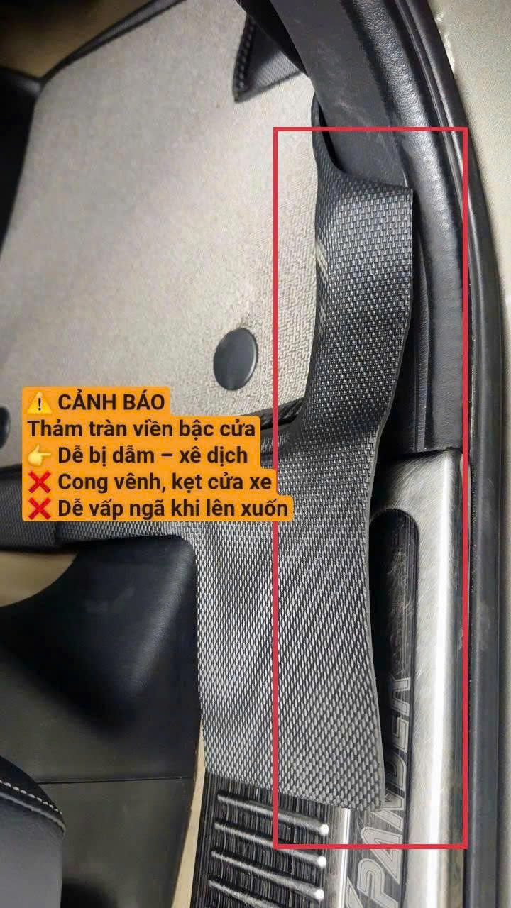 → Chỉ áp dụng cho một số mẫu xe có khe cửa đủ rộng. Thực tế cho thấy thảm tràn viền dễ bị giẫm đạp, xê dịch, kẹt cửa làm biến dạng tấm thảm; thảm lọt lòng Macsim là giải pháp an toàn và bền bỉ hơn.
