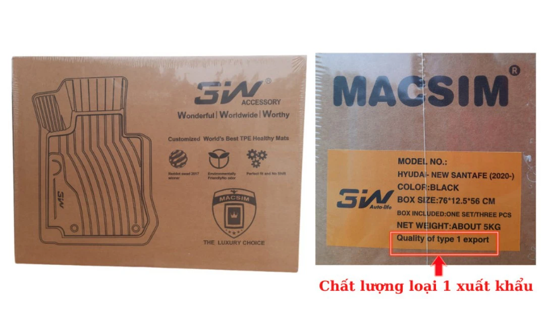 • Thảm đúc khuôn TPE macsim 3w (không phải hàng nội địa giá rẻ loại 2 loại 3) mà đạt tiêu chuẩn chất lượng xuất khẩu sang các nước tiên tiến được nhà máy xác nhận trên tem mầu vàng
