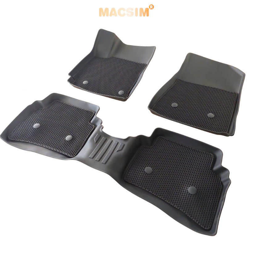 Thảm TPE đúc sẵn theo form sàn, tích hợp gờ cao xung quanh chốt khoá, chống nước và bùn đất lọt xuống sàn nỉ.