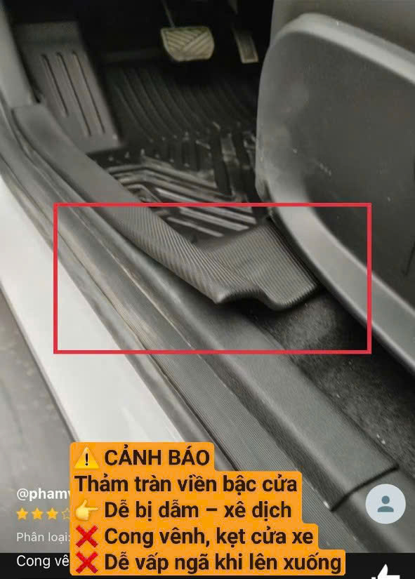 Thực tế sử dụng cho thấy thảm tràn viền ở bậc cửa dễ bị giẫm đạp khi ra vào xe, đặc biệt với trẻ nhỏ, dẫn đến xê dịch, kẹt cánh cửa xe và làm biến dạng tấm thảm sau thời gian ngắn.