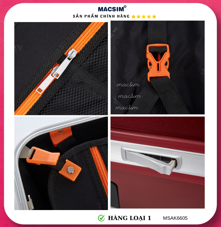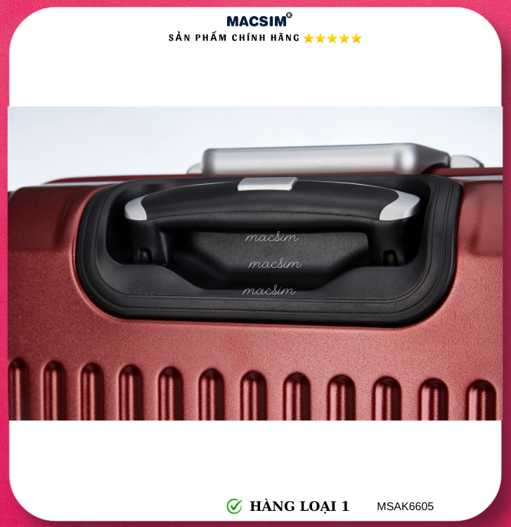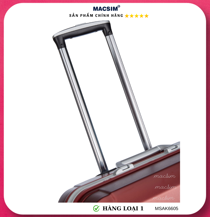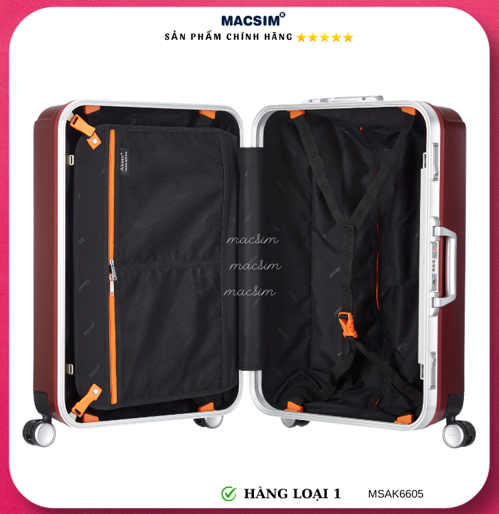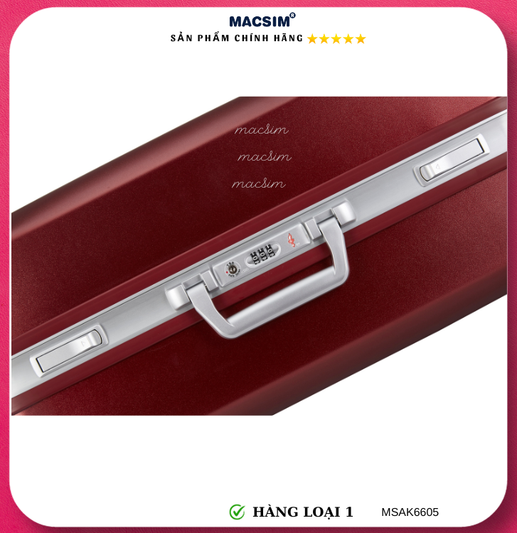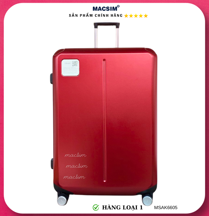 Vali Macsim được làm từ chất liệu nhựa nguyên chất PC. Tấm lót bên trong Poliester 150D xuất xứ Trung Quốc được REACH kiểm nghiệm và phê duyệt, bánh xe 360 độ hãng Hinomata của Nhật ; Khóa kéo thương hiệu SBS xuất xứ Trung Quốc, Khóa TSA hãng Master Lock của Mỹ. Thiết kế vali đơn giản lịch lãm vô cùng sang trọng, bền bỉ, tạo dấu ấn phong cách thời trang cá nhân của bạn trên mọi cuộc hành trình. Vali cao cấp Macssim thích hợp với những người thường xuyên di chuyển cần chiếc vali nhẹ, có độ bền tốt.
