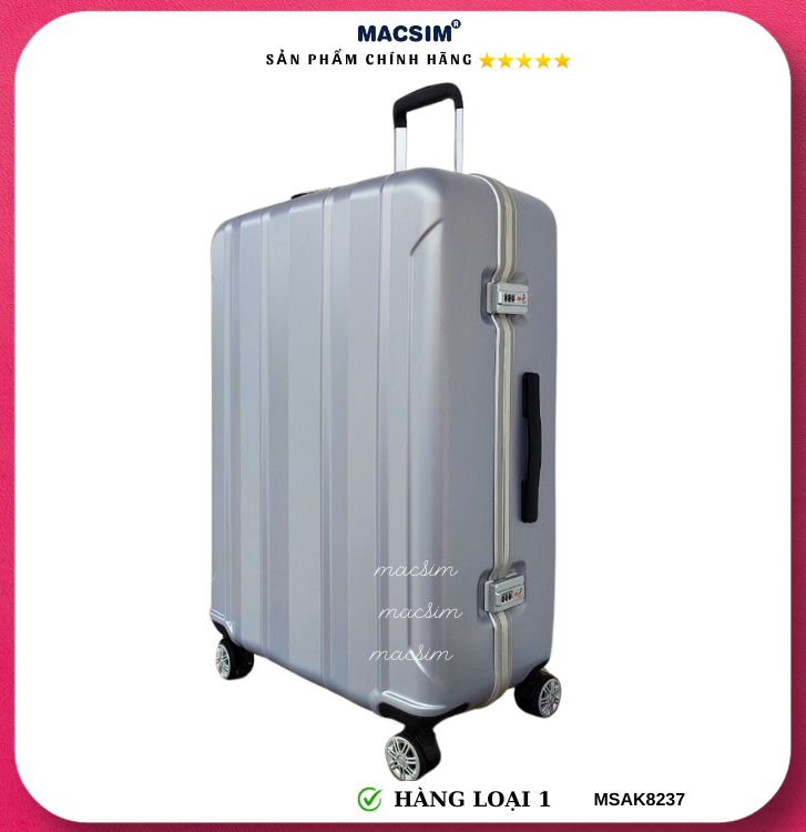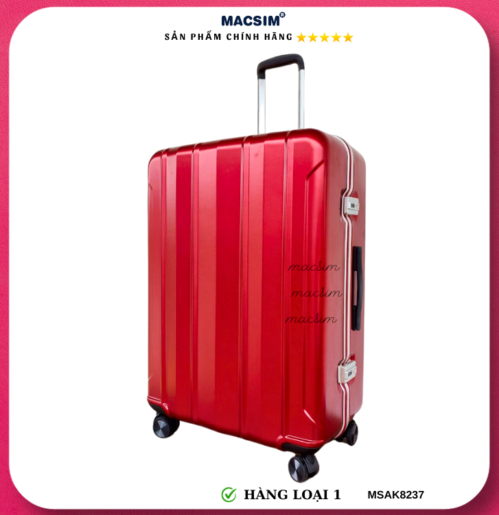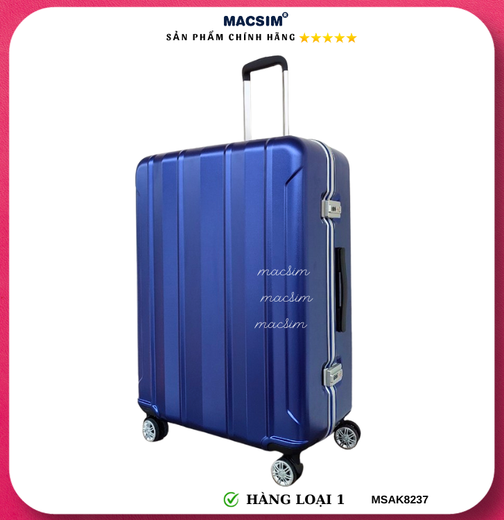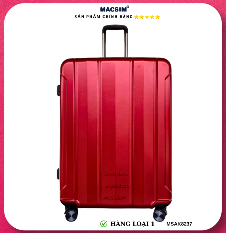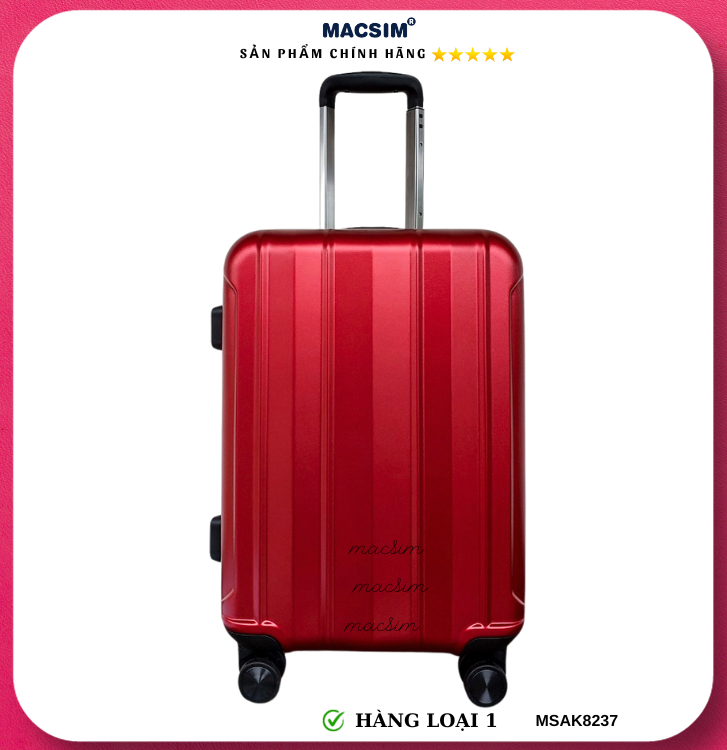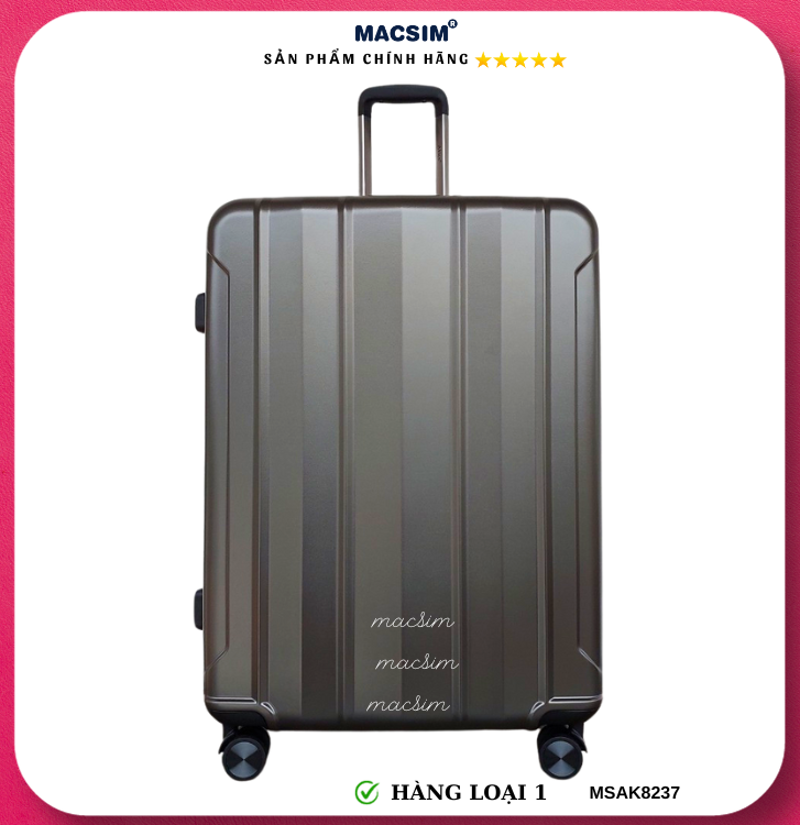 Vali Macsim được làm từ chất liệu nhựa nguyên chất PC. Tấm lót bên trong Poliester 150D xuất xứ Trung Quốc được REACH kiểm nghiệm và phê duyệt, bánh xe 360 độ hãng Hinomata của Nhật ; Khóa kéo thương hiệu SBS xuất xứ Trung Quốc, Khóa TSA hãng Master Lock của Mỹ. Thiết kế vali đơn giản lịch lãm vô cùng sang trọng, bền bỉ, tạo dấu ấn phong cách thời trang cá nhân của bạn trên mọi cuộc hành trình. Vali cao cấp Macssim thích hợp với những người thường xuyên di chuyển cần chiếc vali nhẹ, có độ bền tốt.