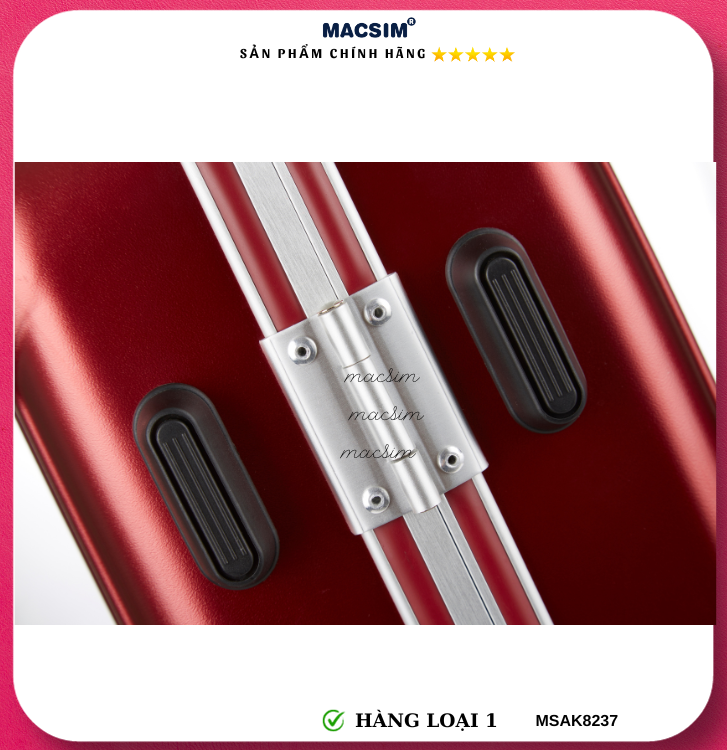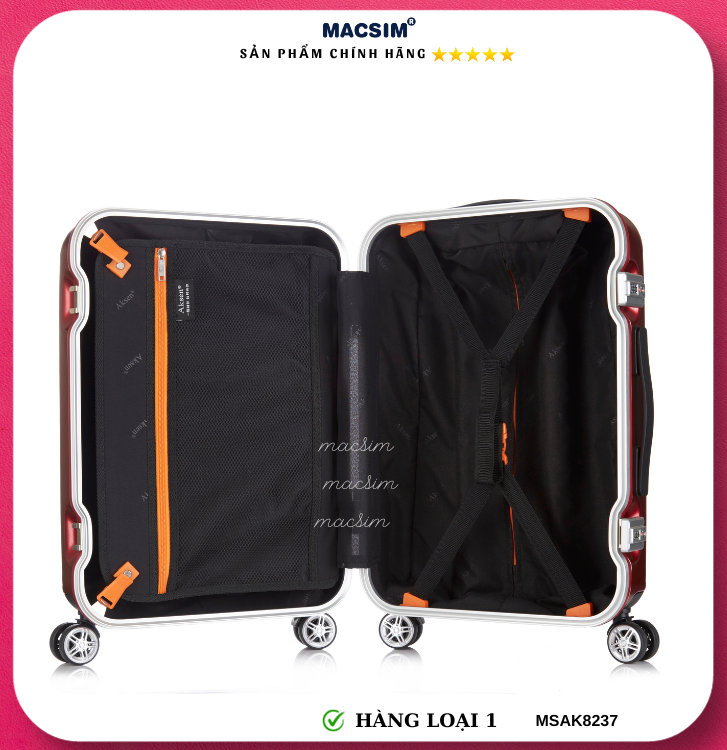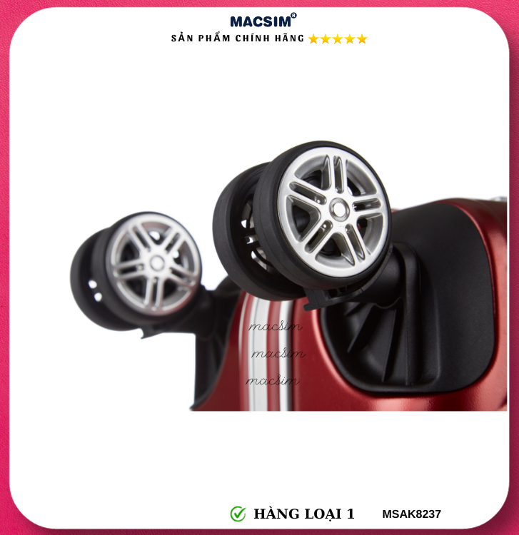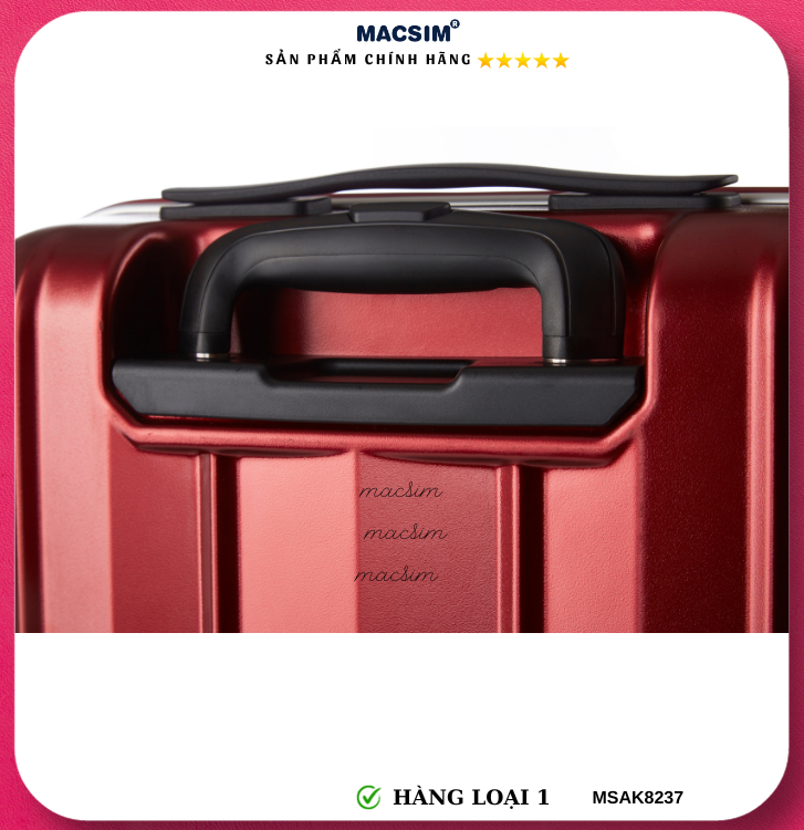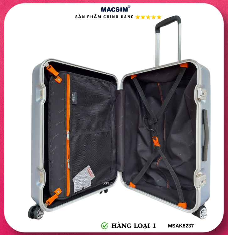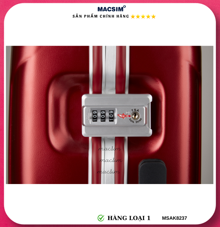 Vali Macsim được làm từ chất liệu nhựa nguyên chất PC. Tấm lót bên trong Poliester 150D xuất xứ Trung Quốc được REACH kiểm nghiệm và phê duyệt, bánh xe 360 độ hãng Hinomata của Nhật ; Khóa kéo thương hiệu SBS xuất xứ Trung Quốc, Khóa TSA hãng Master Lock của Mỹ. Thiết kế vali đơn giản lịch lãm vô cùng sang trọng, bền bỉ, tạo dấu ấn phong cách thời trang cá nhân của bạn trên mọi cuộc hành trình. Vali cao cấp Macssim thích hợp với những người thường xuyên di chuyển cần chiếc vali nhẹ, có độ bền tốt.