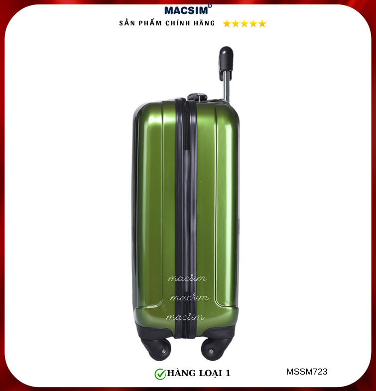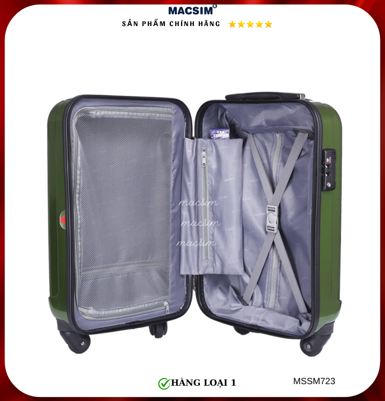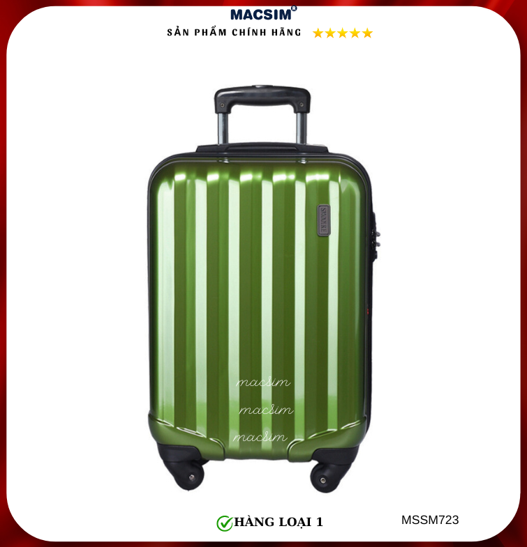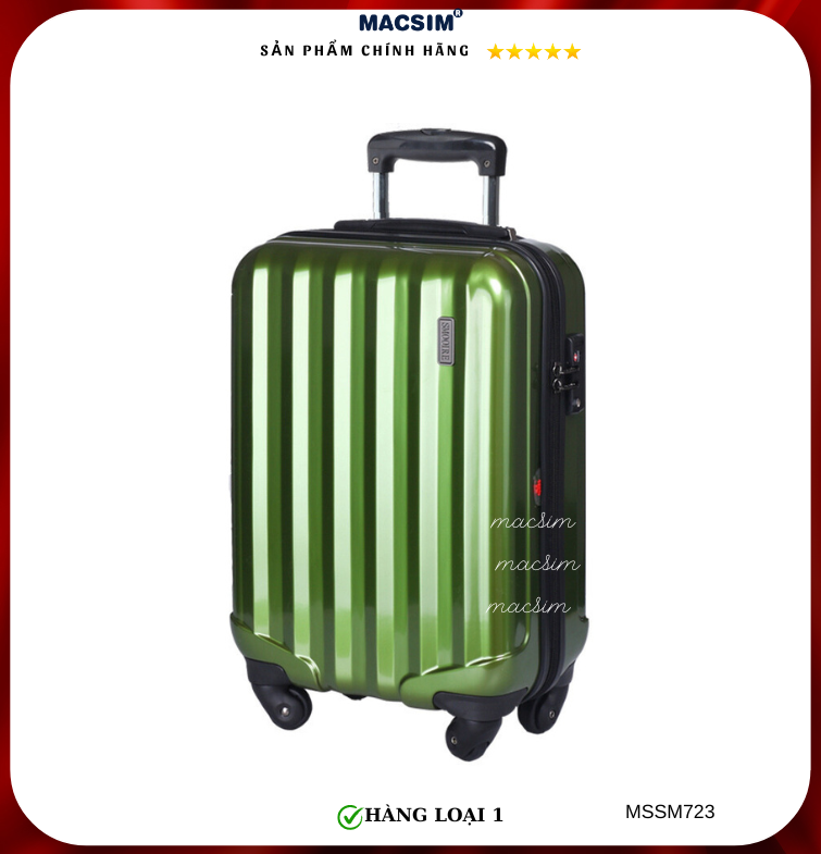 Vali Macsim được làm từ chất liệu nhựa nguyên chất PC. Tấm lót bên trong Poliester 150D xuất xứ Trung Quốc được REACH kiểm nghiệm và phê duyệt, bánh xe 360 độ hãng Hinomoto của Nhật ; Khóa kéo thương hiệu SBS xuất xứ Trung Quốc, Khóa TSA hãng Master Lock của Mỹ. Thiết kế vali đơn giản lịch lãm vô cùng sang trọng, bền bỉ, tạo dấu ấn phong cách thời trang cá nhân của bạn trên mọi cuộc hành trình. Vali cao cấp Macssim thích hợp với những người thường xuyên di chuyển cần chiếc vali nhẹ, có độ bền tốt.