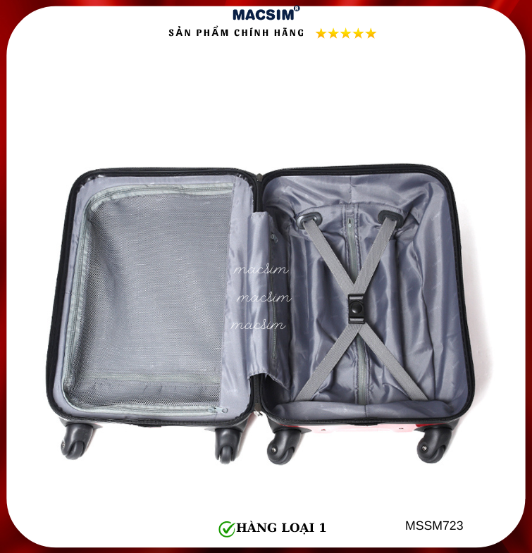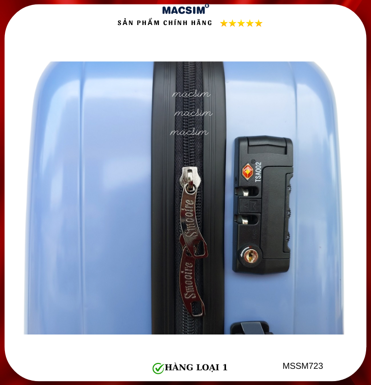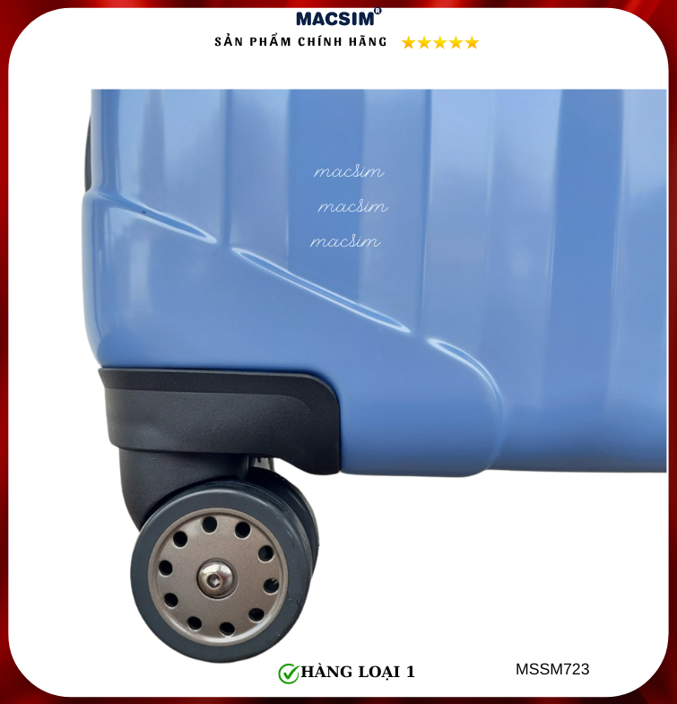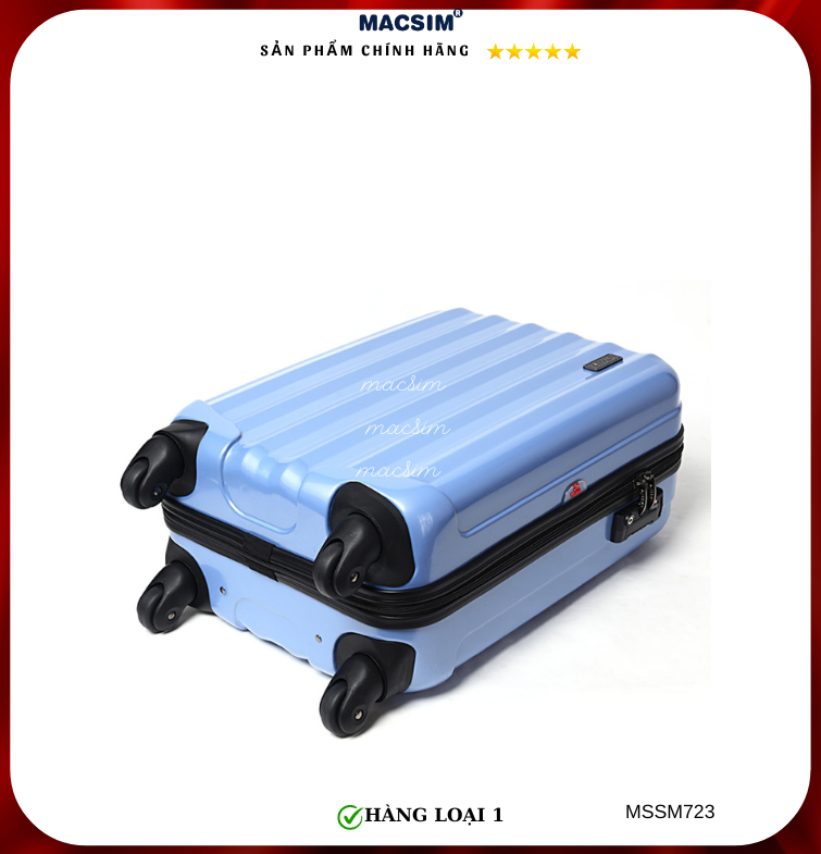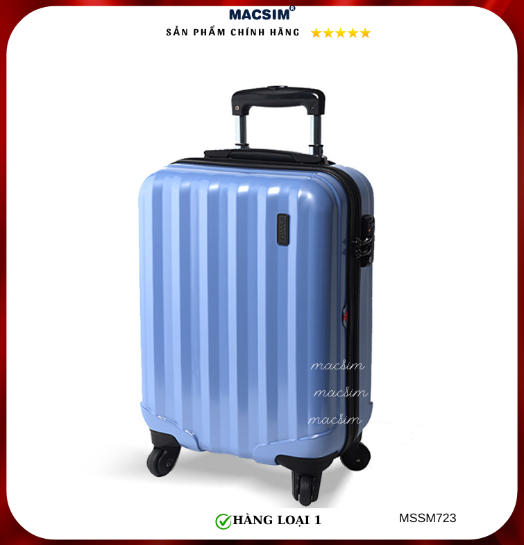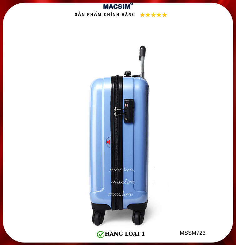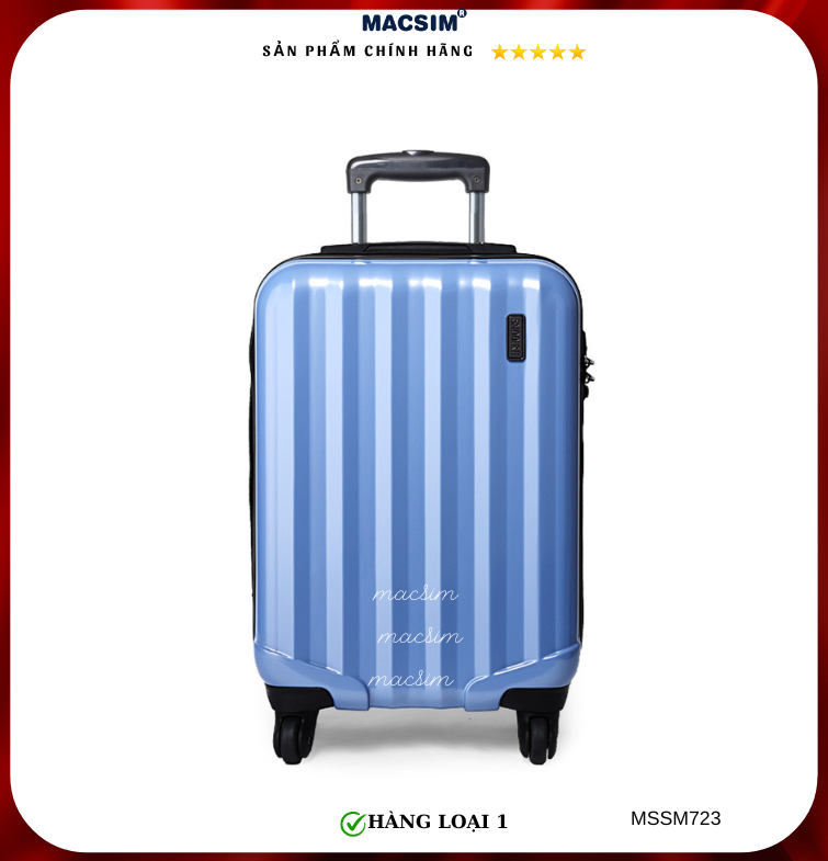 Vali Macsim được làm từ chất liệu nhựa nguyên chất PC. Tấm lót bên trong Poliester 150D xuất xứ Trung Quốc được REACH kiểm nghiệm và phê duyệt, bánh xe 360 độ hãng Hinomoto của Nhật ; Khóa kéo thương hiệu SBS xuất xứ Trung Quốc, Khóa TSA hãng Master Lock của Mỹ. Thiết kế vali đơn giản lịch lãm vô cùng sang trọng, bền bỉ, tạo dấu ấn phong cách thời trang cá nhân của bạn trên mọi cuộc hành trình. Vali cao cấp Macssim thích hợp với những người thường xuyên di chuyển cần chiếc vali nhẹ, có độ bền tốt.